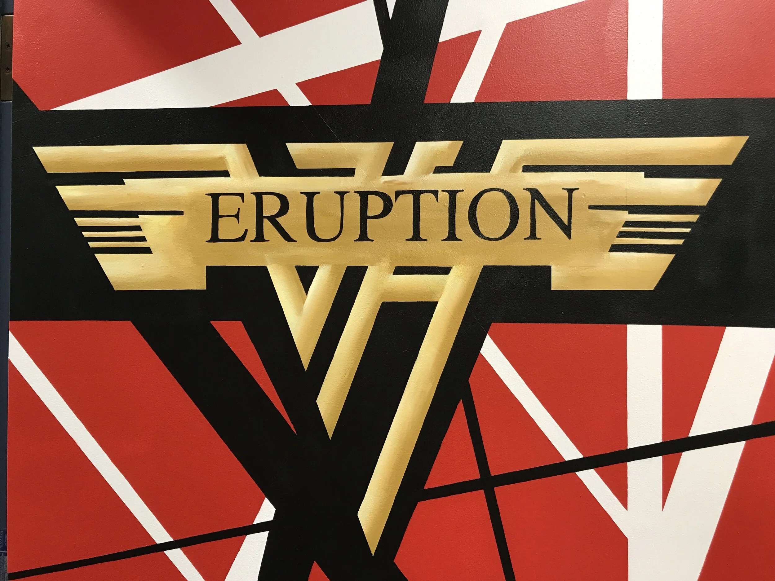 “Eruption” came first. It felt like the right place to start. I pulled directly from Van Halen’s Frankenstrat, the one with the red base and black and white stripes. From a distance, it almost looked like chaotic paint splatter streaks, but up close, there was structure, rhythm, and intention in the lines, just like the music. I finished the door with the name in that unmistakable Van Halen-style font.
