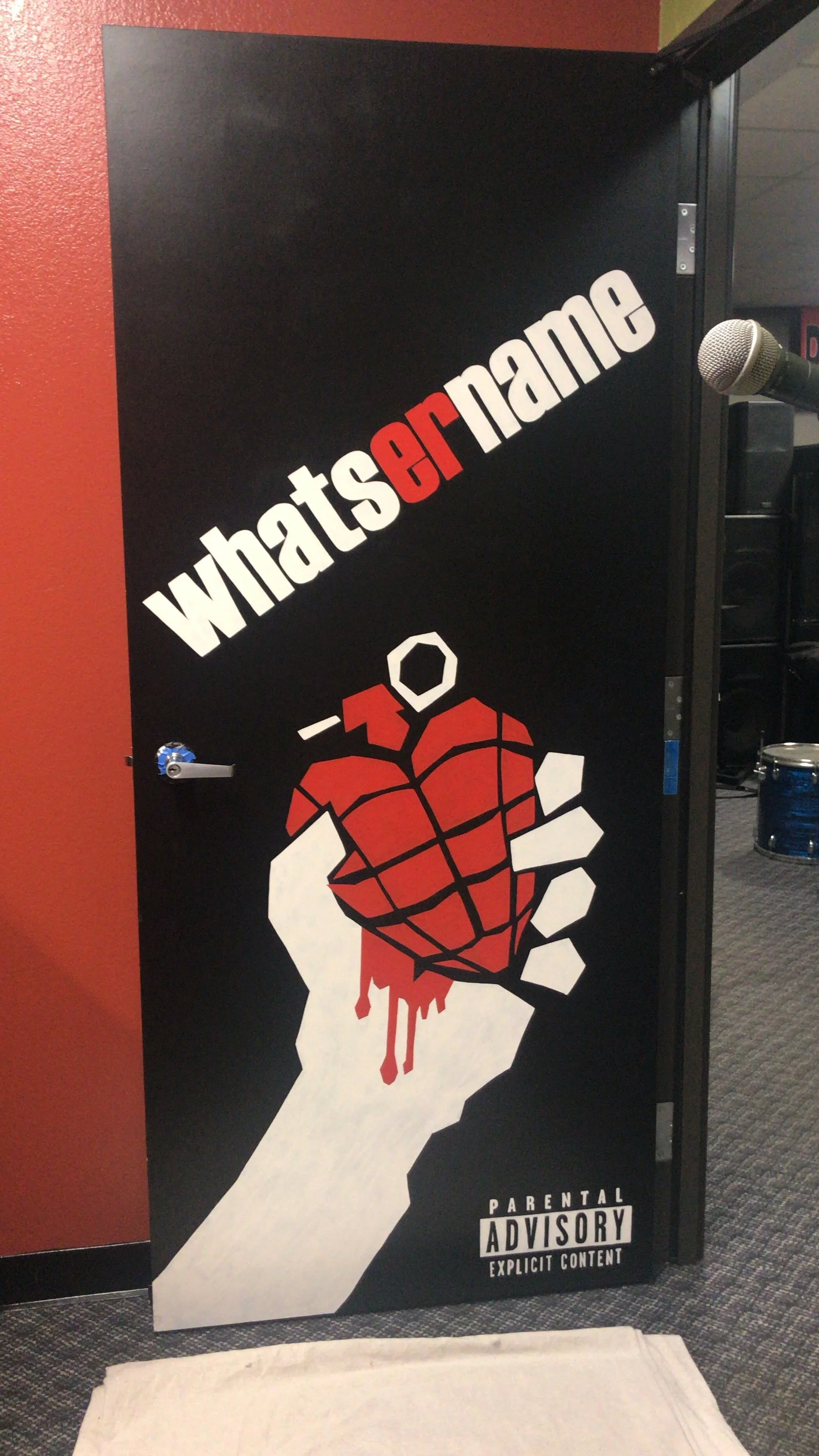 Then came “Whatsername.” A little simpler, but still bold. Black background, the title in red and white, and the bleeding heart grenade from American Idiot. I added a parental advisory sticker in the corner because… why not? These doors were fun so I wanted to have fun with them.
