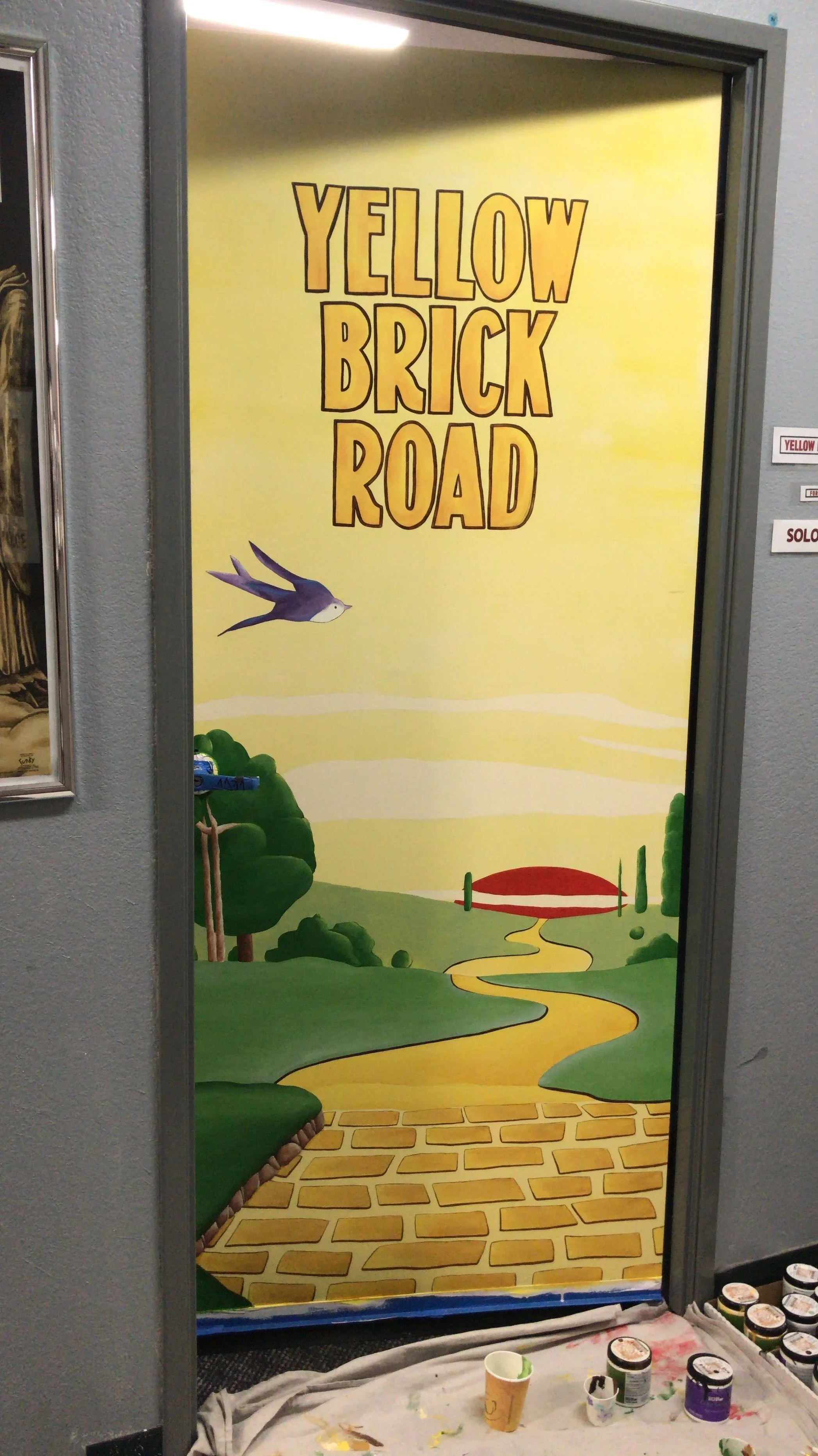 The last one I tackled was “Yellow Brick Road.” I reworked the classic imagery with the road, the rising sun, and the sparrow so it fit the shape of the door. One thing I changed: I took Elton John out of it. He wasn’t the one walking into that room; the musician was.